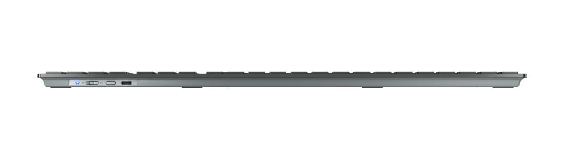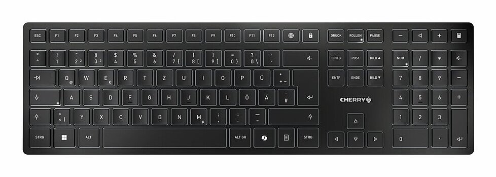 CHERRY KW 9100 SLIM. Facteur de forme du clavier: Taille réelle (100 %). Style de clavier: Droit. Technologie de connectivité: Sans fil, Interface de l'appareil: RF sans fil + Bluetooth, Interrupteur à clé de clavier: Commutateur de touche « ciseaux », Disposition des touches du clavier: QWERTY, Nombre de touches du clavier: 111, Utilisation recommandée: Universel. Couleur du produit: Noir, Gris