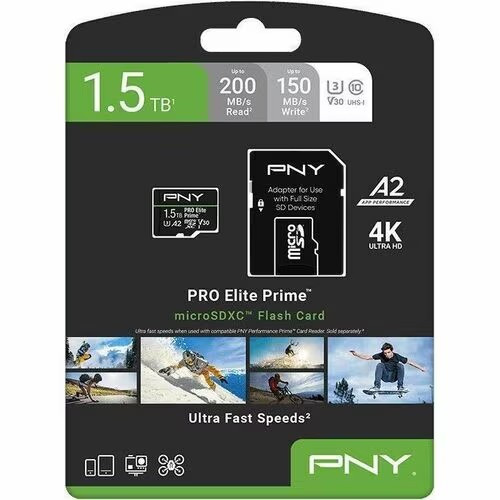 Carte microSDXC PNY PRO Elite Prime - 1,50 To - Classe 10/UHS-I (U3) - V30 - 1 - 200 Mo/s en Lecture - 150 Mo/s en Écriture - Garantie à vie