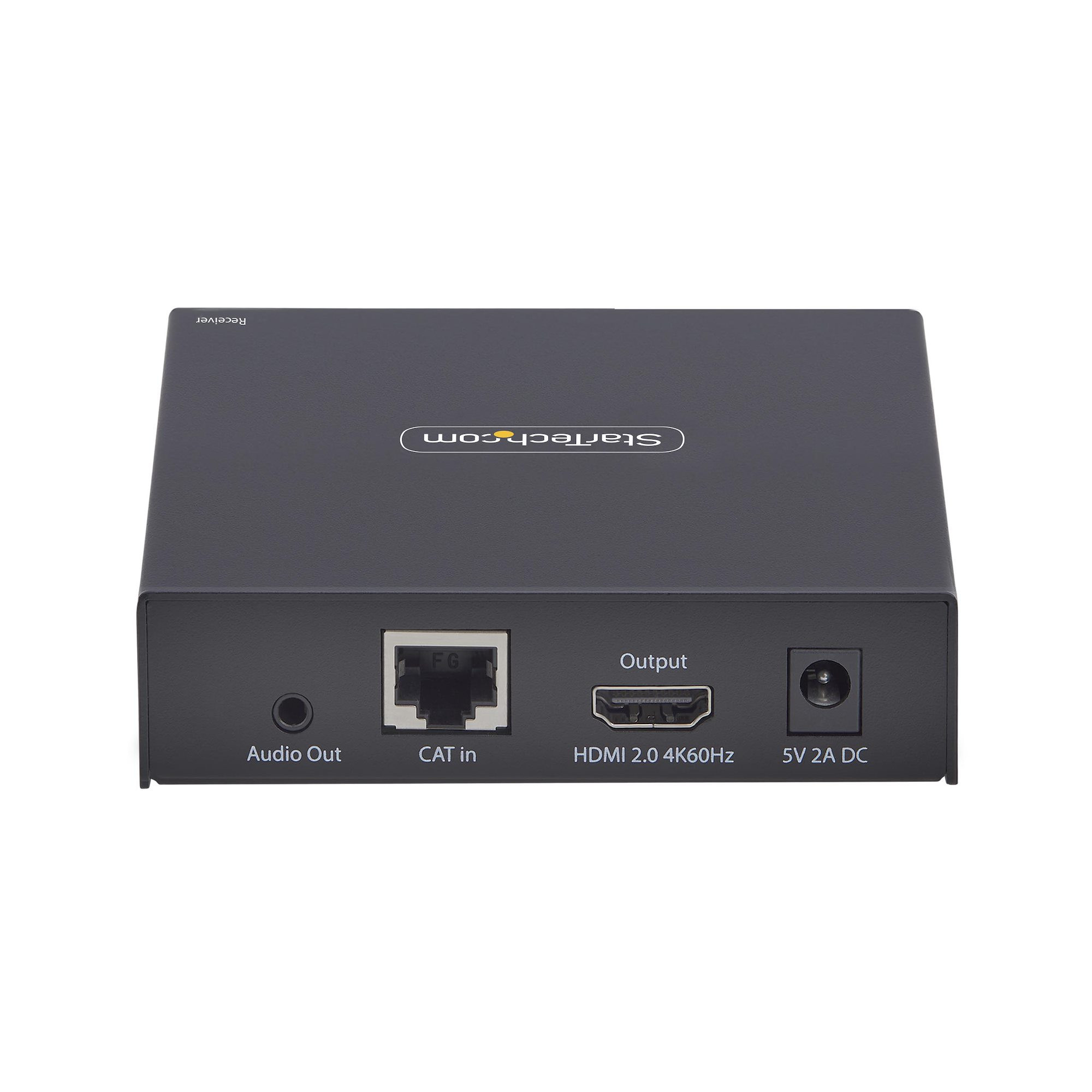 Le récepteur dispose d'un boîtier métallique robuste avec des kits de montage pour une installation murale ou sous bureau, ainsi que de pieds en caoutchouc pour la stabilité sur un bureau. Les ports de passage RS232 et audio 3,5 mm permettent l'extension des signaux série et audio.
