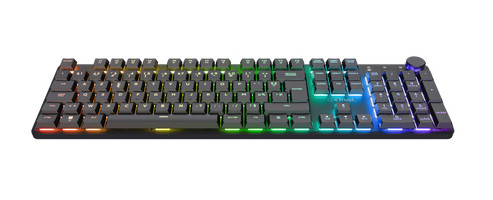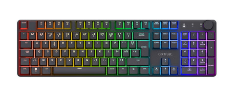 Trust GXT 868 Torix. Keyboard form factor: Full-size (100%). Keyboard style: Straight. Connectivity technology: Wired & Wireless, Device interface: RF Wireless + USB, Keyboard key switch: Mechanical, Keyboard layout: AZERTY, Keyboard number of keys: 104. Backlight type: RGB LED. Cable length: 70.9" (1.8 m). Recommended usage: Gaming. Product color: Black