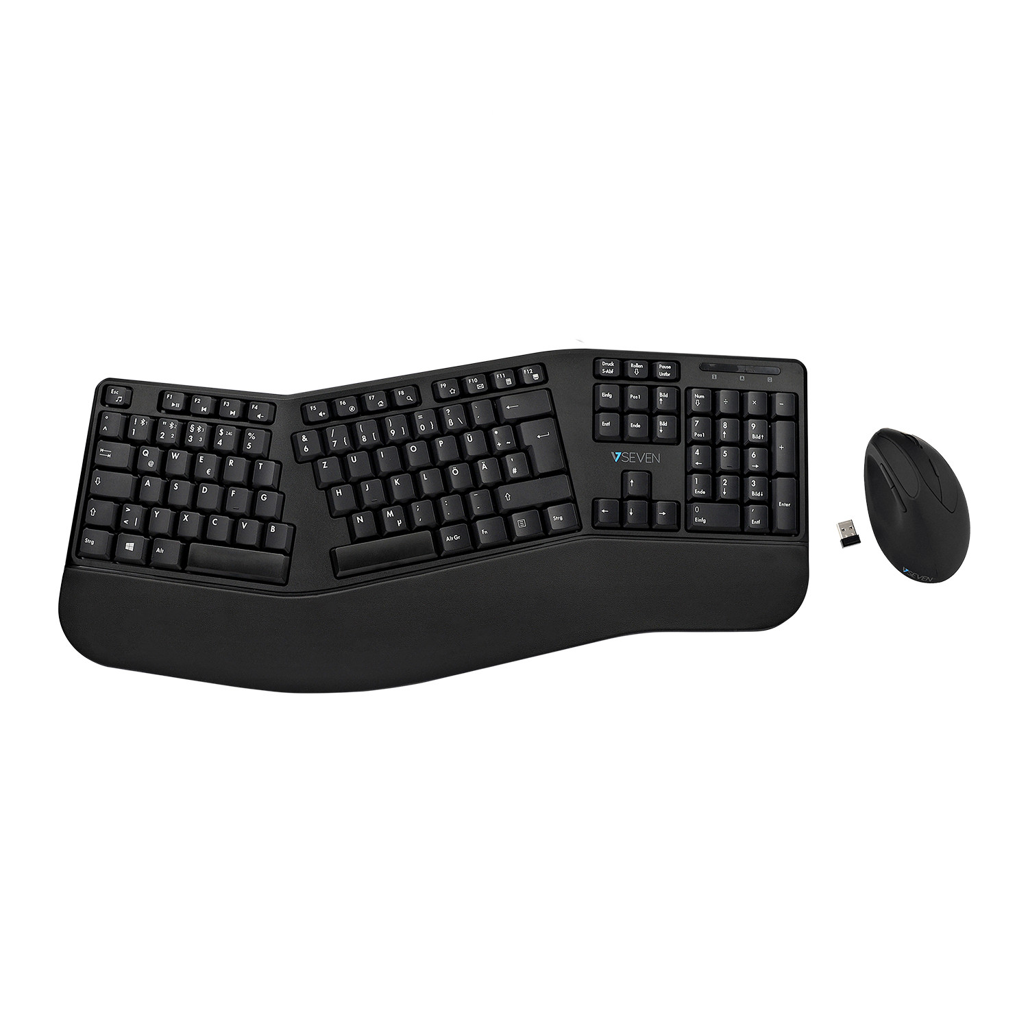 V7 CKW500BTDE. Keyboard style: Curved. Connectivity technology: Wireless, Device interface: Bluetooth, Keyboard layout: QWERTZ, Keyboard number of keys: 105. Wrist rest. Recommended usage: Universal. Product color: Black. Mouse included