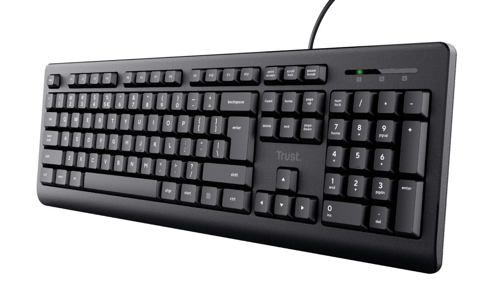 Trust TK-150. Keyboard form factor: Full-size (100%), Device interface: USB, Keyboard key switch: Membrane, Keyboard number of keys: 104. Cable length: 70.9" (1.8 m). Recommended usage: Office. Product color: Black