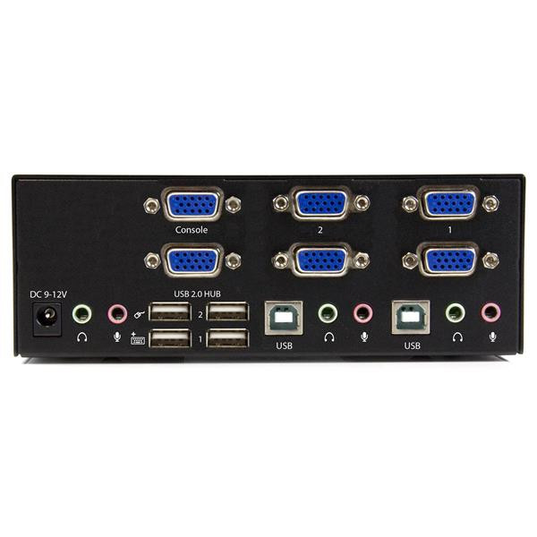This USB KVM lets you connect two computers, each with dual VGA outputs, to a dual-monitor workstation. You can switch the workstation between each computer, as well as two additional USB peripheral devices and 3.5mm speakers & microphone.