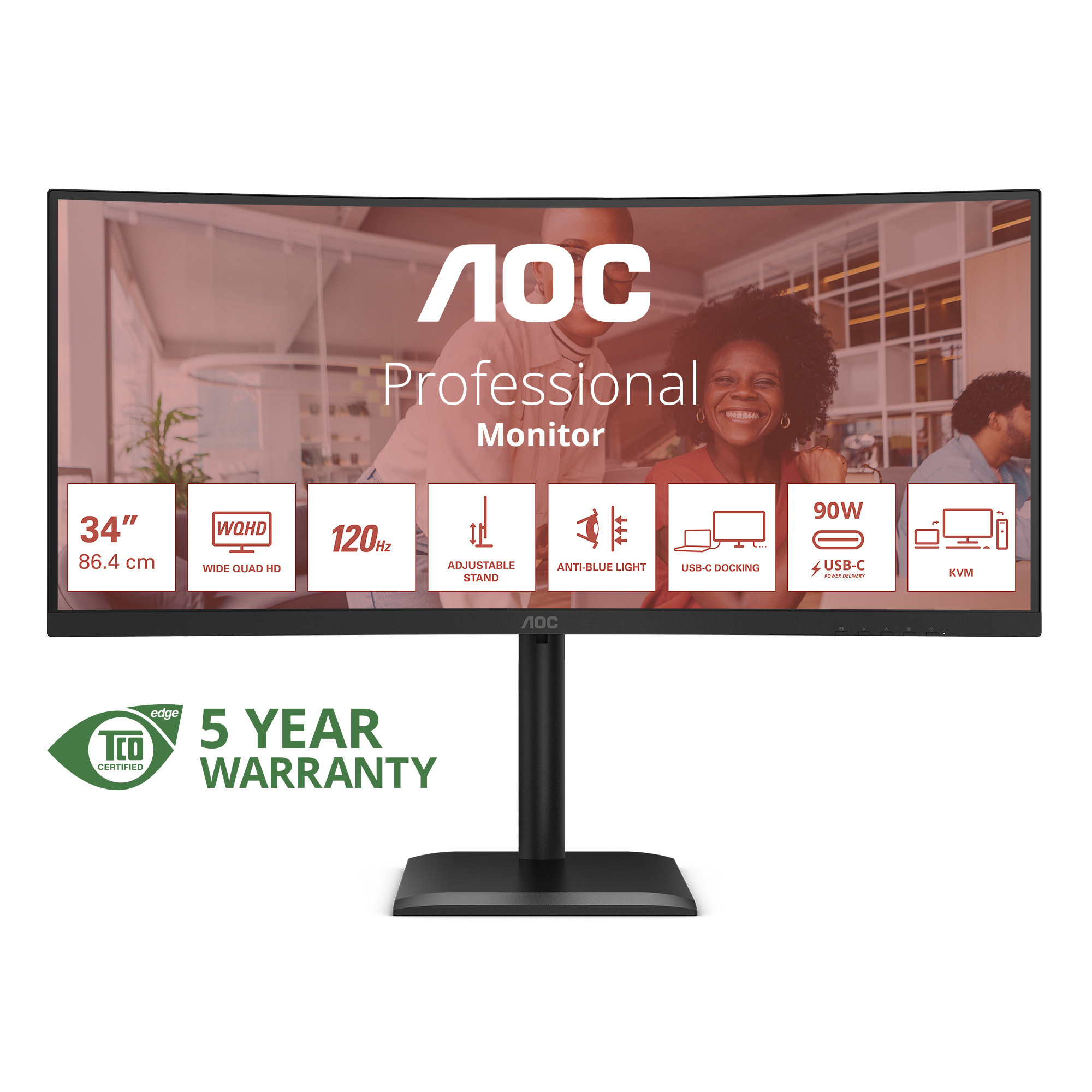 The CU34E4CV offers a 34" WQHD display with a 120Hz refresh rate, HDR10, and Hardware Anti-Blue Light for clear, comfortable viewing. Featuring Smart KVM, a 90W PD docking station, and a sleek, professional design, it's ideal for enhancing productivity and multitasking.