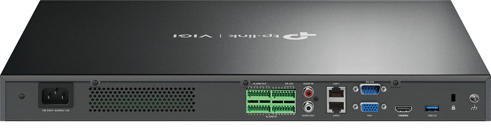 TP-Link VIGI NVR4032H. Video input channels: 32 channels, Maximum resolution: 3840 x 2160 pixels, Number of simultaneously playbacked channels: 16 channels. Maximum storage capacity: 10 TB, HDD interface: SATA. Ethernet LAN data rates: 10,100,1000 Mbit/s, Supported network protocols: UPnP, NTP, ONVIF, CGI. Product color: Black. Power consumption (max): 48 W, AC input voltage: 100 - 240 V, AC input frequency: 50/60 Hz